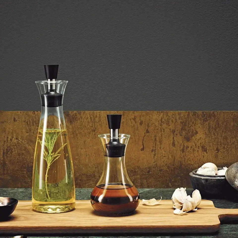 Karafki o pojemności 0,5l do oliwy lub octu wyposażone są w specjalnie wyprofilowane dozowniki, dzięki którym podczas nalewania nie uroni się żadna kropla. Ponadto korek sprawi, że aromat zawartości na długo pozostanie we wnętrzu naczynia. Innowacyjnym rozwiązaniem karafki do oliwy jest szpikuec, którym nabijesz owoce i zioła, by urozmaicić smak i aromat dania.